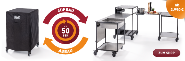Die Faszination unter freiem Himmel zu Kochen und zu Grillen, benötigt nicht immer viel Platz. OMK ist die kompakteste mobile Outdoorküche, die in wenigen Augenblicken, werkzeuglos auf- und wieder abgebaut werden kann.